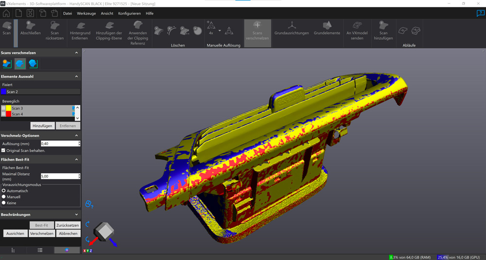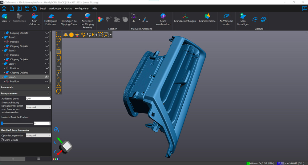 Der HandySCAN 3D von Creaform überzeugte durch seine einfache Handhabung, Genauigkeit und Scangeschwindigkeit. Auch die Verarbeitungsgeschwindigkeit der aufgenommenen Daten war entscheidend: Die VXelements Software ist sehr leistungsstark, bildet die gescannten Daten in Echtzeit ab und verfügt darüber hinaus über interessante Features wie Smart Resolution, das bei kleinen Merkmalen automatisch Scandaten mit höherer Auflösung generiert, um die Qualität und den Detaillierungsgrad zu verbessern.