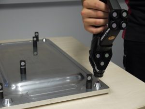 In der Vergangenheit erforderte das Design und die Fertigung von Formwerkzeugen und Vorrichtungen üblicherweise taktile Messungen von Bezugspunktbohrungen und kritische Merkmalsmessungen. Die Lösung von Creaform ersetzte diese umständlichen Geräte jedoch problemlos: genau wie ein Messarm ermöglicht die tragbare und kabellose HandyPROBE fortschrittliches Abtasten. Sowohl die HandyPROBE als auch der MetraSCAN 3D funktionieren im Zusammenspiel mit dem C-Track, einem optischen Kamerasystem, das 6 Freiheitsgrade in einem Volumen von 16 m3 bietet. Die HandyPROBE stellt die kartesische Koordinate einer Komponente oder eines Werkzeug-Bezugpunktes, welche genutzt werden kann, um Werkzeuge herzustellen und Sollpositionen festzulegen oder Oberflächenabweichungen an eine CAD-Datei zu melden, dynamisch zur Verfügung.