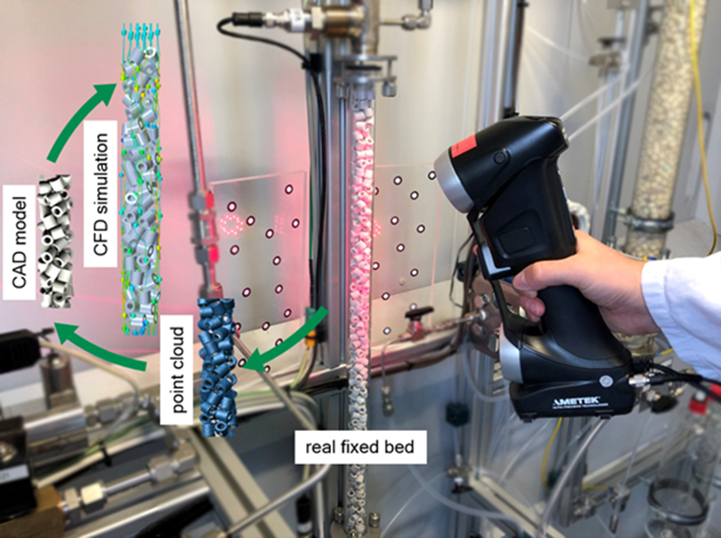 With the help of 3D digitization, the Institute for Chemical and Electrochemical Process Engineering (ICVT) at the Technical University of Clausthal can compare real bed structures with synthetically generated fixed beds and thus improve simulation methods. Furthermore, 3D digitization using mobile optical measuring methods such as the HandySCAN 3D can provide a fast and cost-effective alternative to computed tomography (CT) or magnetic resonance imaging (MRI) for the digitization of fixed beds.