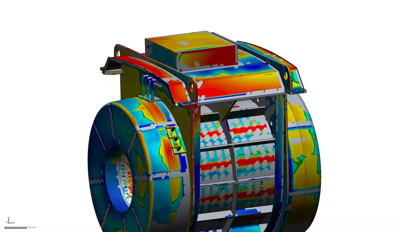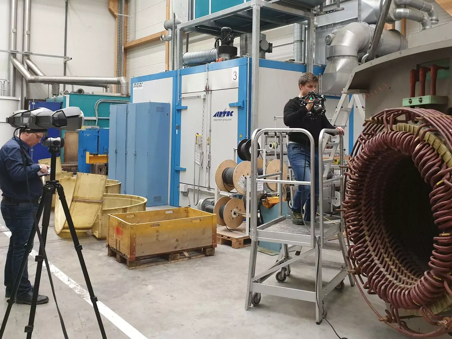 In this particular use case, an electric motor, with a dimension of approximately 2x2x2.5 metres, was scanned. Approximately 35 square metres were captured with the MetraScan 3D. Individual measurements, in places that were not accessible to the scanner, were recorded with the HandyPROBE optical PCMM and stored together with the scan data. Even the measurements of winding head covers made of fiberglass could be taken without being disassembled.