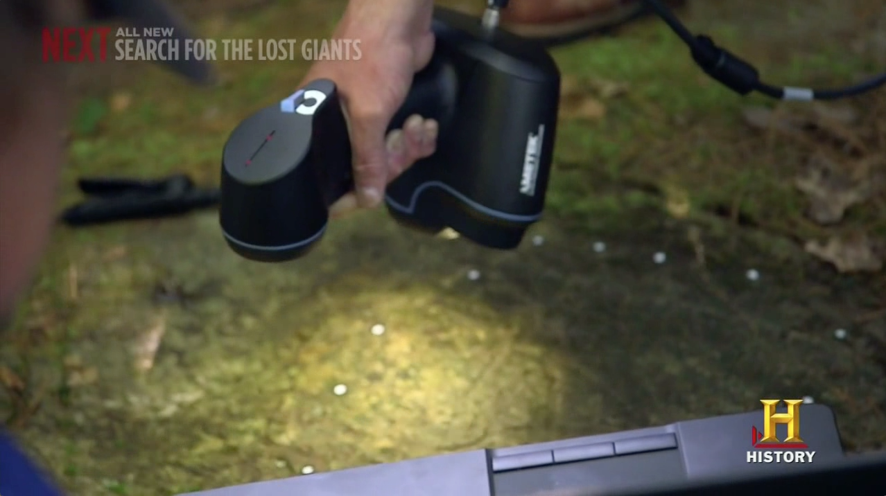 Presented above are screen captions from the History Channel series Curse of the Oak Island. It clearly shows a Creaform Go!SCAN 50 handheld 3D scanner used to digitize a mysterious petroglyph, or rock engraving.