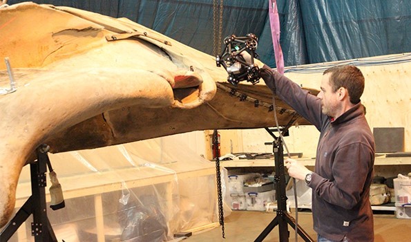 First, the engineers laid out small reflective surfaces on and around the skull. The engineers relied on the MaxSHOT 3D, an optical coordinate measuring/photogrammetry system ideal for large-scale projects such as Hope. Working with the MaxSHOT 3D means processing objects measuring from 2 to 10 meters, with an accuracy of 0,015 mm/m. The engineers took digital photographic images to compute the locations of each target and thus came up with a permanent reference frame. And so, since the skeleton is susceptible to movement for it is suspended by wires, dynamic referencing (i.e., dynamic tracking) was of utmost importance.