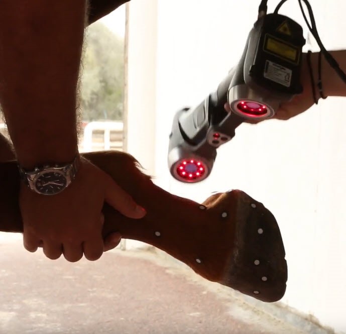 benefit from 3D-printed moulds and polymers (EquiMold) manufactured by FormaHoof to correct foot asymmetry and toe/heel irregularities, and to relieve pain. The moulds result from the 3D scanning of horse hoofs using positioning targets, displaying with great accuracy the asymmetry between legs and local lamina irregularities. In a large-scale perspective, the implementation of these technologies revolutionizes the racing and breeding industries, allowing for further improvements to horse performance. As Mike de Kock puts it, horse stables can be somewhat compared to F1 stables.