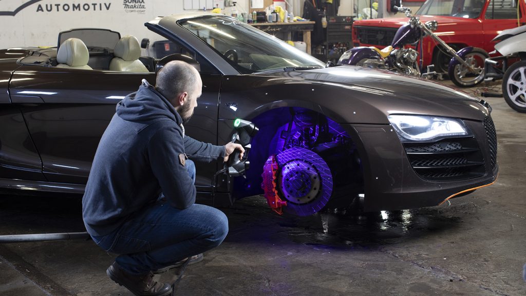 It took 58 seconds only to scan half the helmet while they were drifting at high speed all around the racetrack. The result was surprisingly good considering the environment, the sun, and some shiny surfaces. Not to mention they had our legacy HandySCAN 700. Now imagine the results we could have gotten with our improved HandySCAN BLACK launched in April of this year. With our previous technology, shiny or black surfaces without prior preparation (i.e. mattifying spray) and sunlight could be an inconvenience. You don’t have to worry about any of that no more. It is now one of the most versatile 3D scanners out there. Thanks to a combination of great improvements — blue laser technology (check our 3D laser scanner buyer’s guide), improved optical hardware, and an advanced algorithm — it captures more and better data than ever before.
