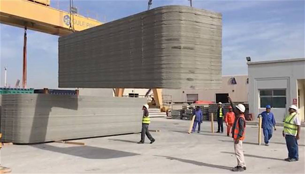 The architectural 3D printer, located in Shanghai, used concrete mixed with other materials to produce walls, floors and ceilings on their side; the pieces were then tilted vertically. In order to produce actual building blocks, the sizeable 3D printer had to be 20 feet high (6,6 m), 120 feet long (32 m) and 40 feet (10 m) wide. Just like prefab building sections, the 3D-printed components were then shipped to Dubai and assembled on site.