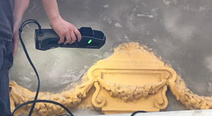 In the past, Go!SCAN SPARK 3DTM has proven itself to be most suitable for similar tasks, as demonstrated by a multitude of previous case studies. With Go!SCAN SPARK 3D, for example, measurements are done without any contact; there is no need to use target points, which would normally be required and placed directly on the object to be measured for this type of measurement. Also, to perform the task, each element had to be approached to a distance of 30 cm. The portability of this handheld scanner was then ideal due to its size, as access to each item was limited. This assignment required the precision of this device as well (exactitude, point cloud resolution x and y) to accurately reproduce the details and richness of form of each ornament. Another important feature of this particular scanner was the possibility to scan the texture and colors of the objects, in addition to the geometry.