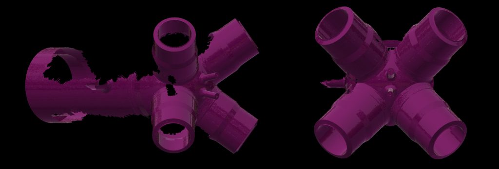 Once fabricated, the final product was scanned using the Creaform handheld HandySCAN 3D scanner and VXelements software. The scanning lasted approximately three hours. A mesh was created to show the geometry of the manufactured product. This mesh was then overlaid onto the initial 3D model. The data was analyzed and processed using a combination of software such as CloudCompare, MeshLab and Meshmixer. This process allowed the team to check the accuracy with which the headers were manufactured and whether they were produced according to spec.