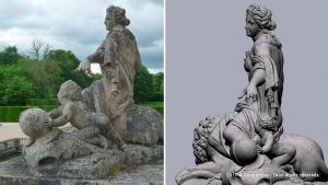 Although restoration is, first of all, performed by cleaning the works of art, it was strongly suggested to find a method that would preserve the 61 statues of the estate, without damaging them and keep their memory alive. Thanks to 3D scanning, Gexpertise’s modeling division, a specialist in the technical study of buildings and expert in 3D models worked on the estate’s digital preservation by creating a heritage archive using a hand-held 3D scanner. “In addition to cleaning the 61 statues included in the restoration project, considering this significant undertaking performed in statuary garden, the CAHM also recommended the archiving of assets in its call for tenders,” says Benoit Desriaux, project manager at Gexpertise. Indeed, the slow or accidental disappearance of fragile parts of these works makes it even more important to safeguard a memory of their original shape, as complete as possible so as to be able to reproduce a copy in the future. A contemporary and inexpensive technique is 3D digitization. It replaces plaster molding, thus avoiding physical storage and allows the production of derivative products to communicate the image.