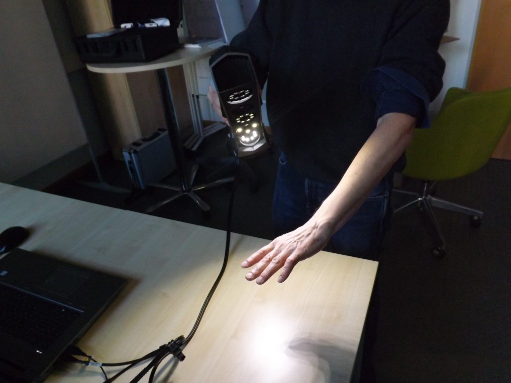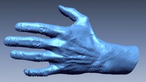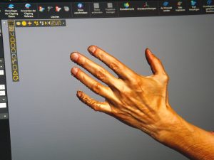 As a first step, the students scanned a hand with Creaform Go!SCAN 3D scanner for which the orthosis should be developed (fig. 1). Then, data has been treated in VXelements software (fig. 2). This means cleaning up the overlapping image points and removing geometry offsets. The reduced scan file will be stored in STL format for further processing with Rapidform program (fig. 3).