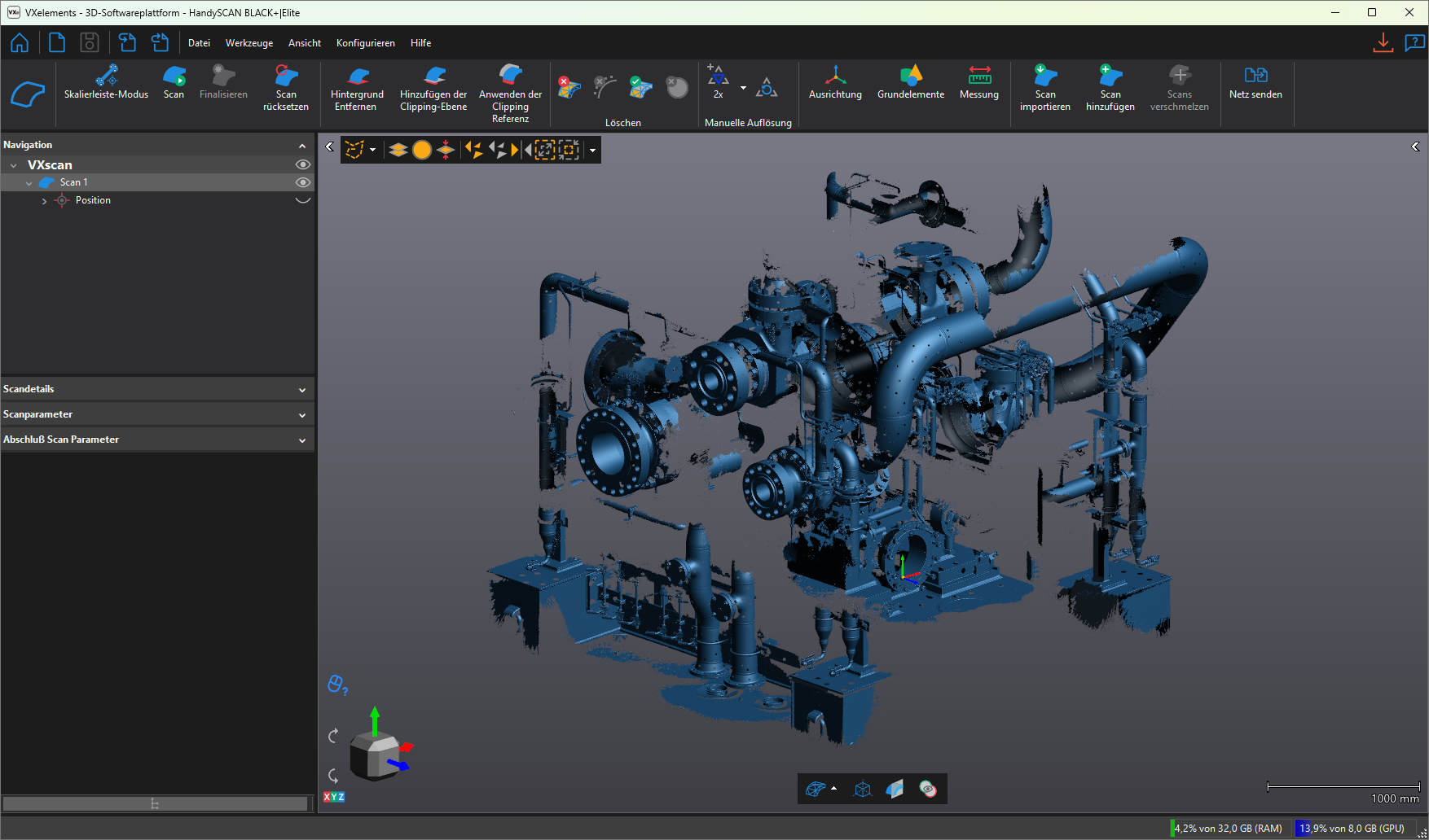 Because of the machine’s large dimensions—approximately 3 m × 3 m × 3 m—a combination of photogrammetry and 3D scanning was required to achieve high accuracy across the entire assembly. The solution also provided the flexibility to scan large components quickly and efficiently from a longer distance using the Far Mode, which limited the number of targets, while the Near Mode allowed for the capture of smaller areas with fine detail and resolution. For medium-sized components, the Scale Bar Mode offered an effective alternative to photogrammetry, maintaining accuracy while further simplifying the workflow.