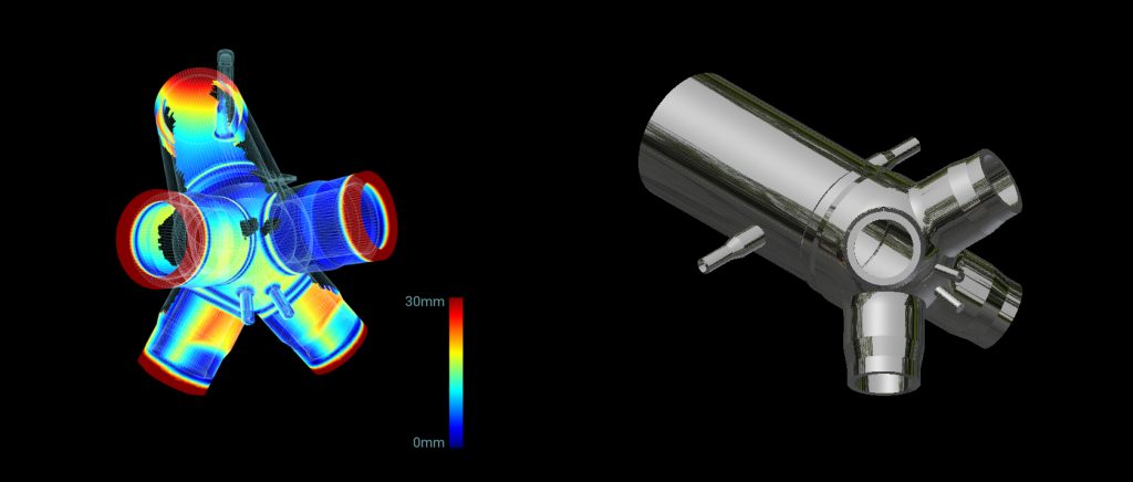 Una vez fabricado, el producto final se escaneó usando el escáner portátil HandySCAN 3D de Creaform y el software VXelements. El escaneado duró aproximadamente tres horas. Se creó una malla para mostrar la geometría del producto fabricado. Luego, esta malla se superpuso al modelo 3D inicial. Los datos se analizaron y procesaron usando una combinación de software como CloudCompare, MeshLab y Meshmixer. Este proceso le permitió al equipo verificar la precisión con la cual se fabricaron los cabezales y si se produjeron de acuerdo con las especificaciones.