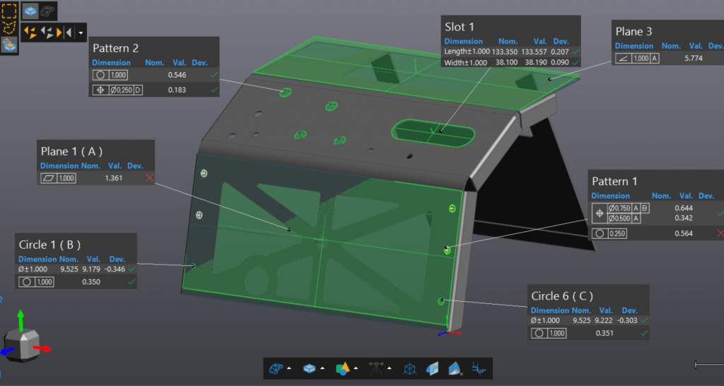 GD&T se entrelaza con el proceso de inspección. Una de las fases esenciales del control de calidad y el aseguramiento de calidad es la adquisición de datos, que se pueden obtener con medición manual, palpado táctil o escaneado 3D. Usando estas técnicas, tomamos una parte física y la digitalizamos. Luego, determinamos si los valores medidos corresponden a las entidades geométricas esperadas, también conocidas como GD&T. Vemos si pasa o falla comparando los datos medidos con las dimensiones que se muestran en los modelos CAD. Más importante aún, podemos cuantificar la desviación de las tolerancias límite.