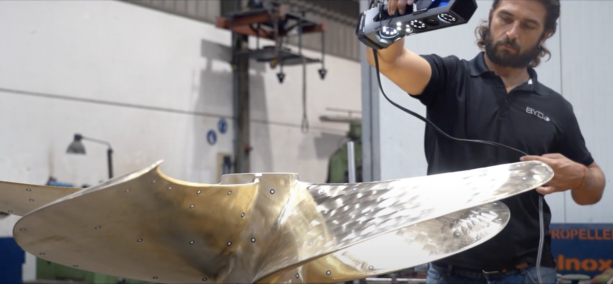 Con un escáner 3D portátil, no hay limitaciones. La sesión de escaneado puede ocurrir en cualquier lugar. Mientras la hélice esté fuera del agua y sin el arnés, los ingenieros pueden realizar el escaneado y, una hora más tarde, están listos para regresar al taller y analizar los datos. Además, no solo se puede utilizar el escáner 3D para comprobar la pieza, sino que también se puede utilizar para medir el espacio interior antes de una fase de rediseño. - Mejor proceso de diseño