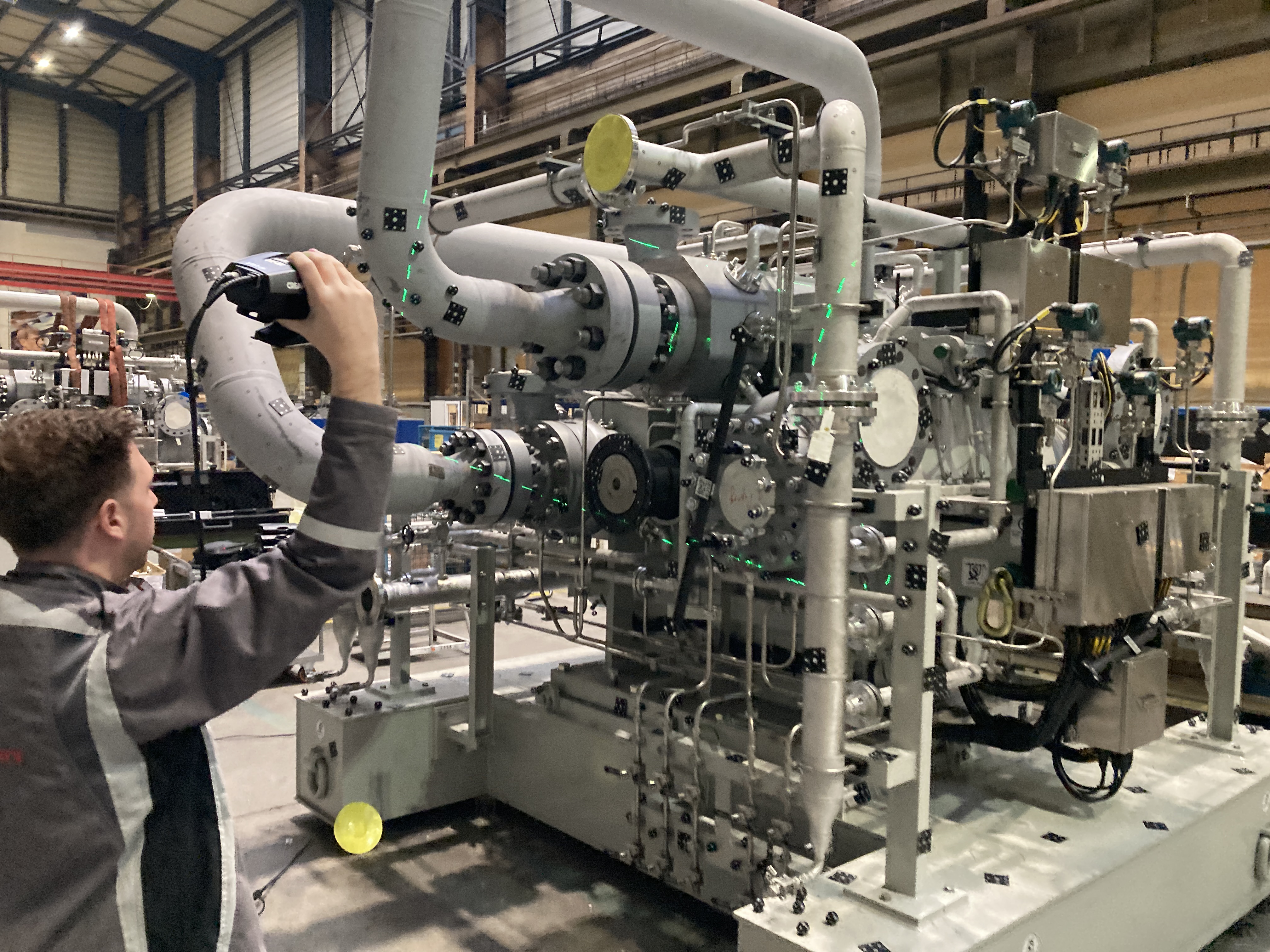 Everllence, un’azienda di primo piano nella tecnologia della propulsione, dell’efficienza energetica e della decarbonizzazione nei settori marittimo, energetico e industriale, ha affrontato la sfida di ispezionare diversi compressori centrifughi radiali a sei stadi identici tra loro, con trasmissione a ingranaggi, per la cattura, l’utilizzo e lo stoccaggio del carbonio. Ogni macchina, della grandezza di circa 3 m × 3 m × 3 m, richiedeva misurazioni 3D accurate di tutte le flange di ingresso e di uscita, e anche delle posizioni e delle interfacce dei tubi esistenti. L’obiettivo era stabilire l’entità delle deviazioni delle superfici di collegamento dal modello CAD e individuare possibili differenze tra le singole macchine.