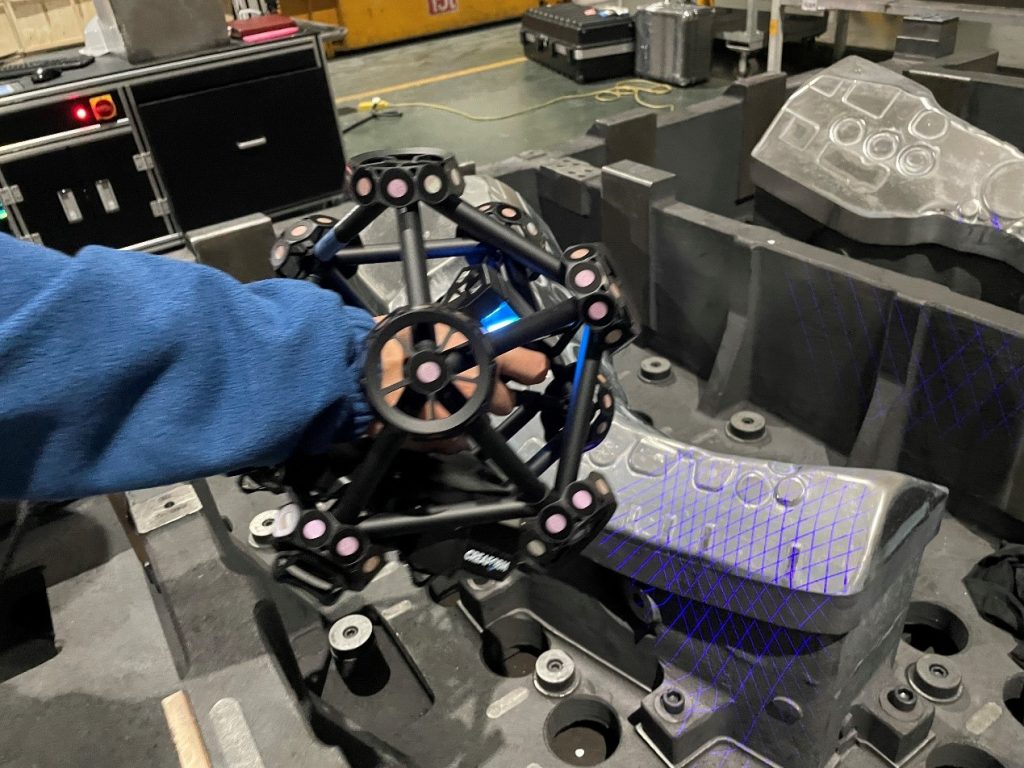 传统的检测设备,如三坐标等固定式检测设备,由于对环境、温湿度有着严格的要求,无法满足直接在冲压模具车间进行检测的需求,而来回搬运模具又会导致额外的人工和成本,且检测效率相对较低,因此,该客户迫切需要一套可在复杂环境下进行高精度测量的便携式检测系统。而配备高精度、高速和操作简便等优势的Creaform 形创公司的便携式光学三坐标扫描仪 MetraSCAN 3D正好可以充分满足该客户的各种需求。