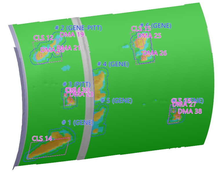 外部腐蚀图案的叠加,这是通过将 3D 扫描数据与 ILI 数据相关联来实现的,其中可能有位置偏移